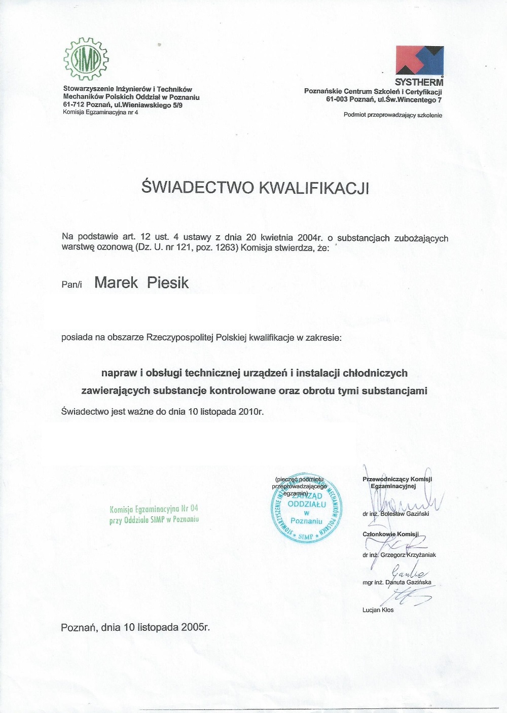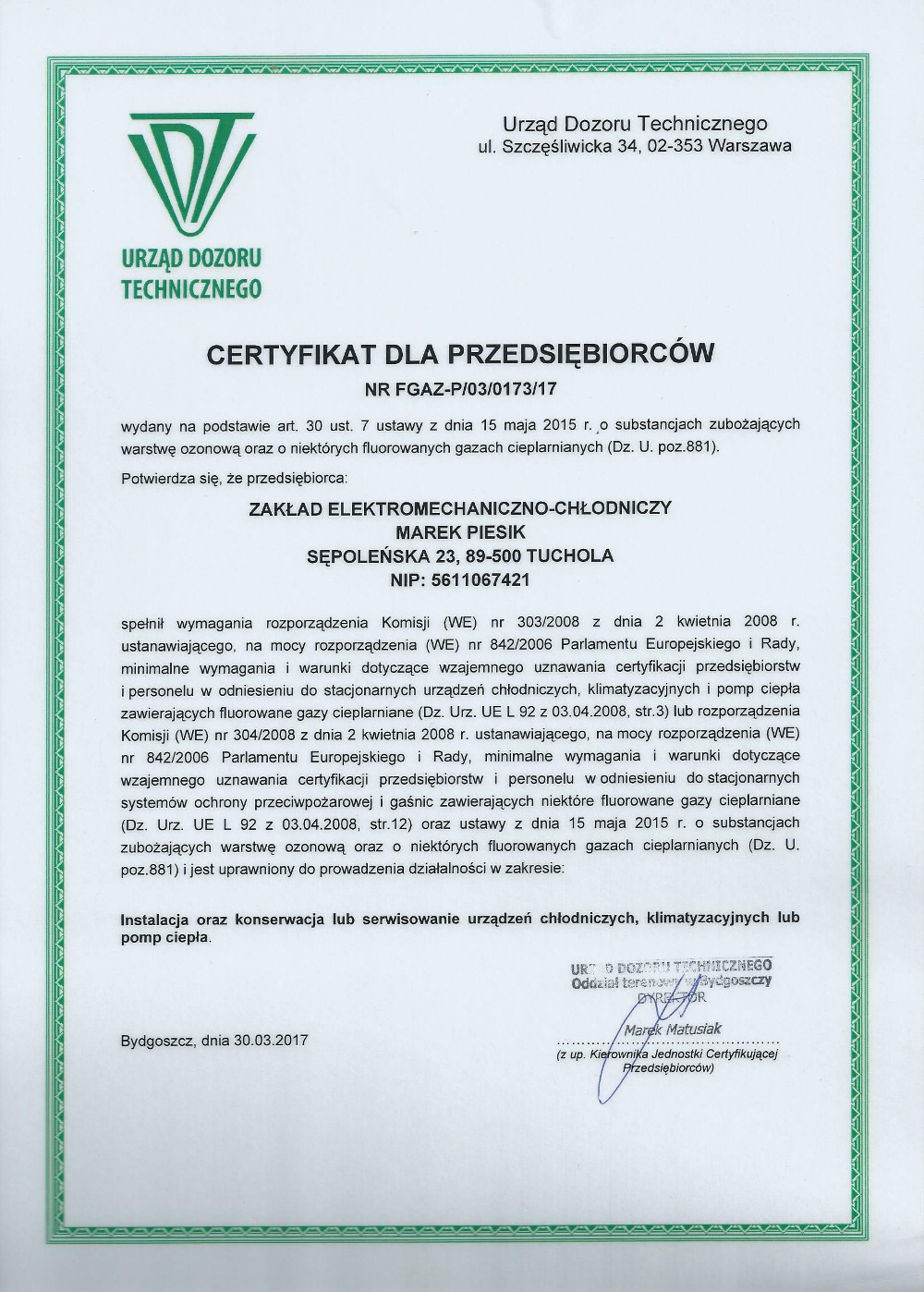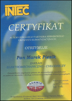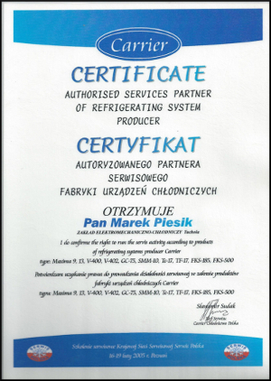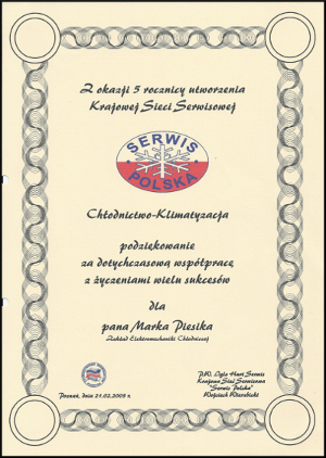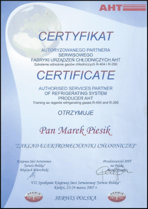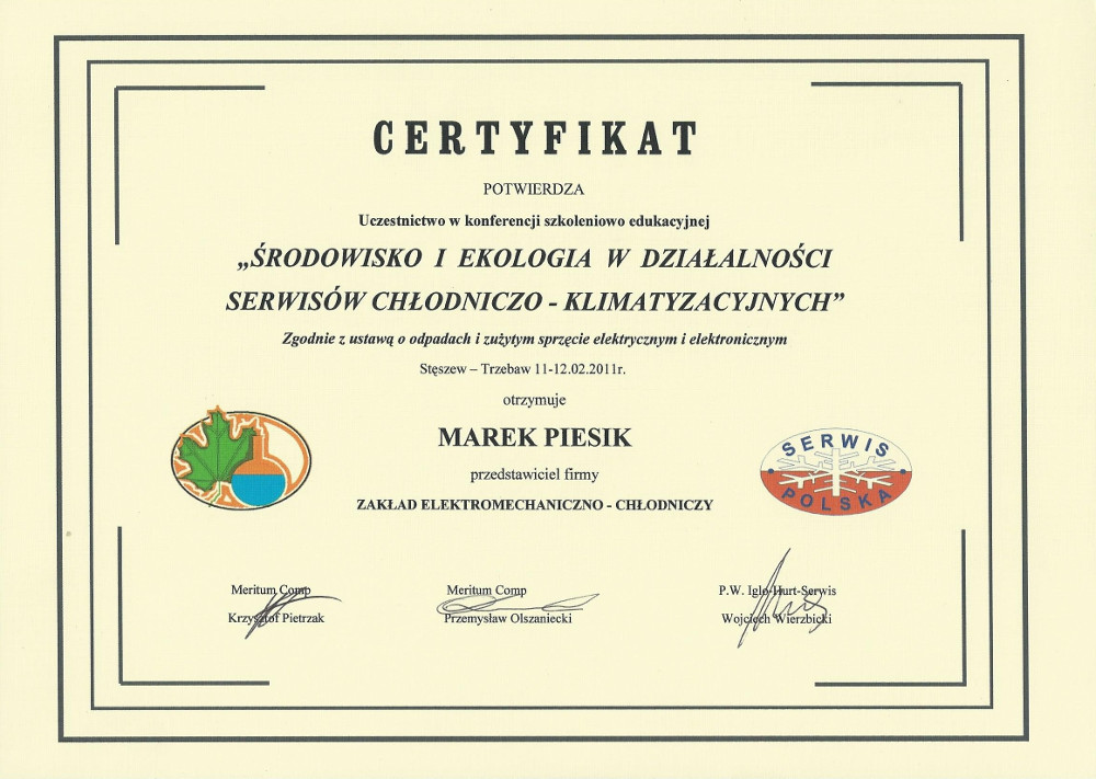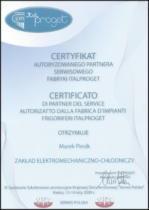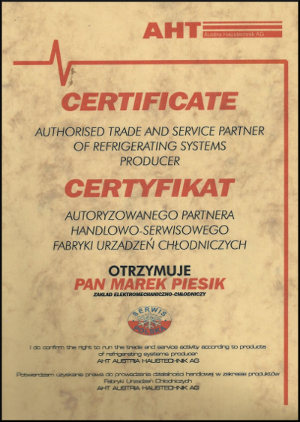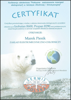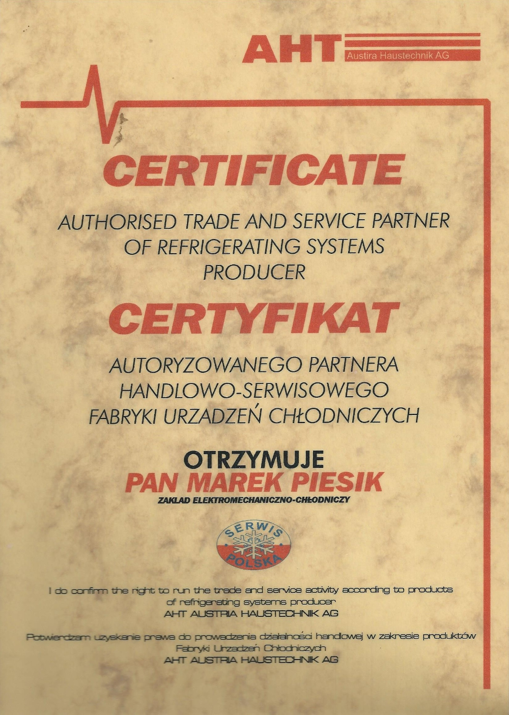 Zakład elektromechaniczno-chłodniczy prowadzę od 1987 roku. Na początku zajmowałem się naprawą sprzętu AGD oraz przezwajaniem silników i naprawą elektronarzędzi. Po pewnym czasie działalność rozszerzyłem o drobne chłodnictwo (lodówki, zamrażarki). W międzyczasie rozpocząłem regeneracje agregatów do urządzeń przemysłowych. W dalszym rozwoju firmy zacząłem montować komory chłodnicze, zbiorniki do mleka oraz dojarki z instalacjami wodnymi. Przystąpiłem również od 2002 roku do sieci serwisantów obsługujących markety między innymi : IGLO-HURT-SERWIS POZNAŃ, IBC EURO SERWIS SP. Z.O.O. WROCŁAW, SYSTEM SERWIS POZNAŃ, TAM POLSKA. Rozpocząłem współprace z kontrahentami sprzedającymi klimatyzatory. W związku z tym rozpocząłem montaż oraz konserwacje klimatyzatorów firm LENNOX, LG, WHIRLPOOL, VIVAX oraz pomp ciepła. Później zacząłem też montaż komór chłodniczych.
