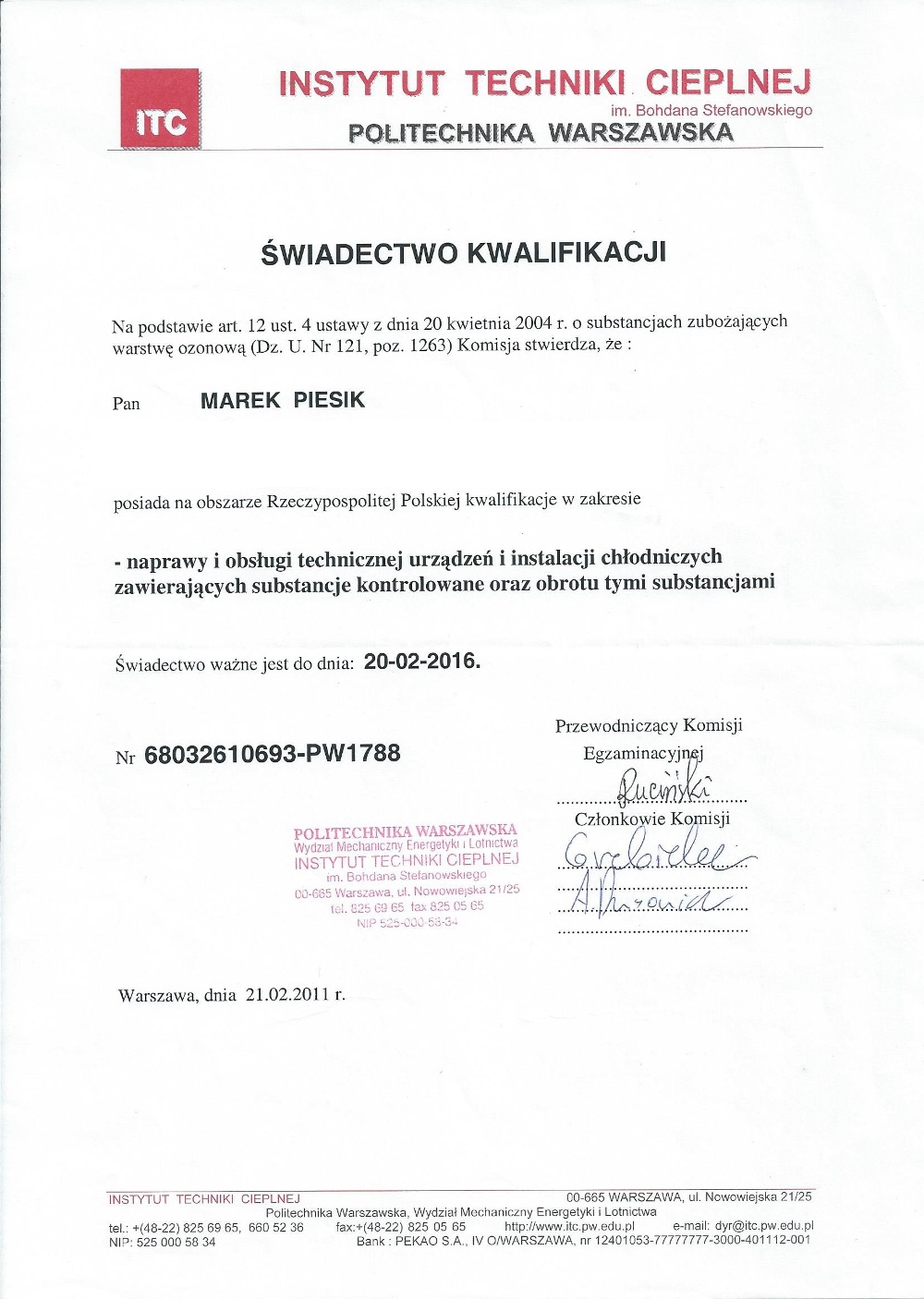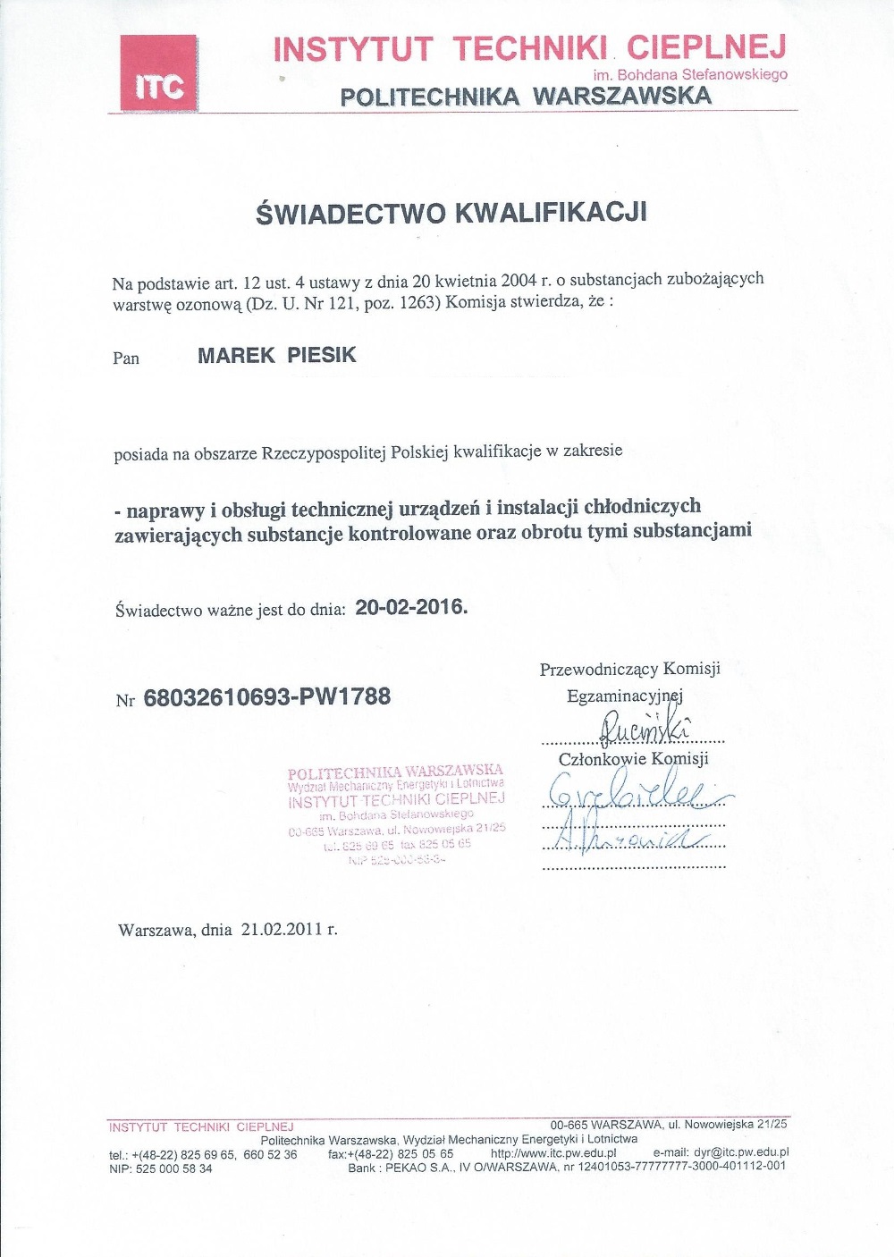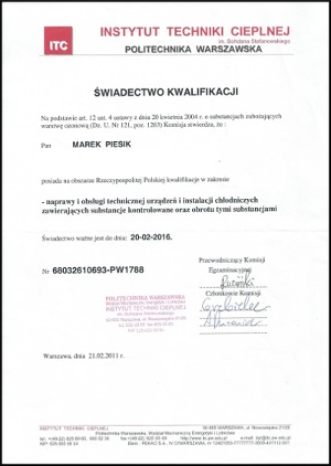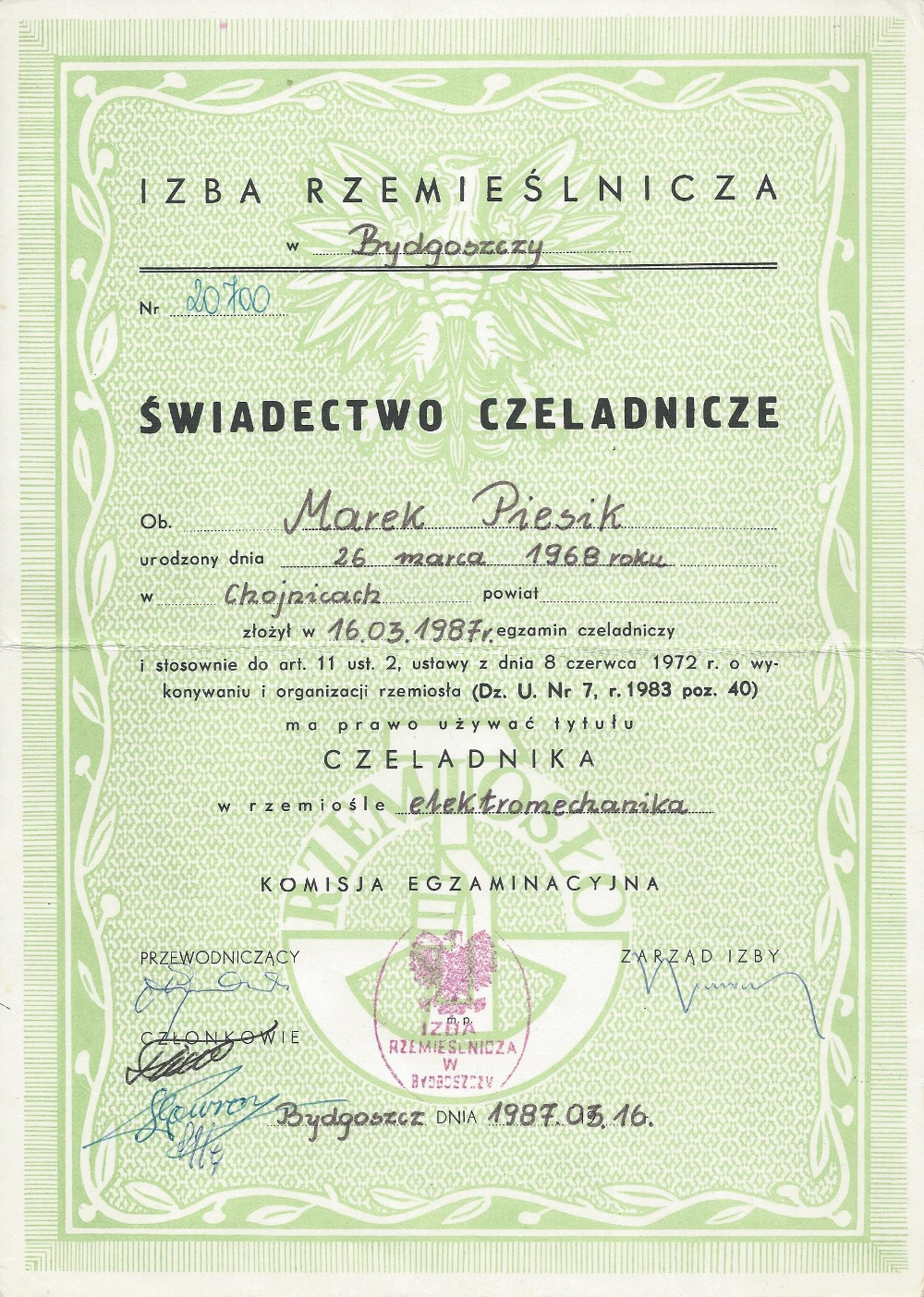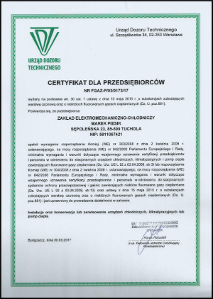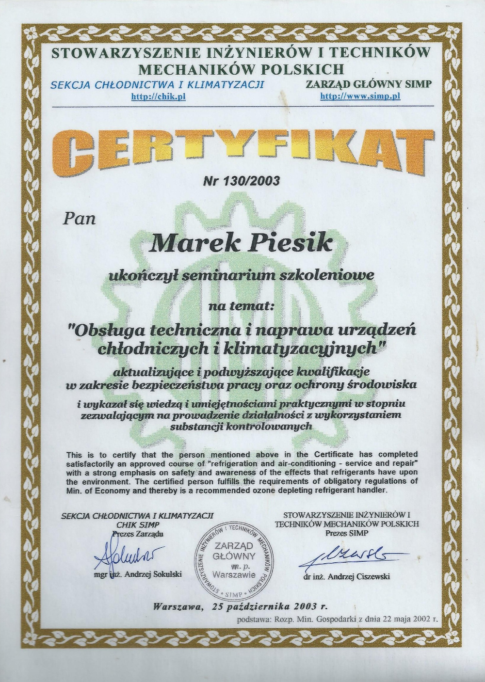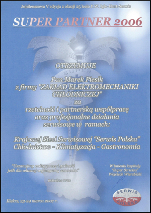 Zakład elektromechaniczno-chłodniczy prowadzę od 1987 roku. Na początku zajmowałem się naprawą sprzętu AGD oraz przezwajaniem silników i naprawą elektronarzędzi. Po pewnym czasie działalność rozszerzyłem o drobne chłodnictwo (lodówki, zamrażarki). W międzyczasie rozpocząłem regeneracje agregatów do urządzeń przemysłowych. W dalszym rozwoju firmy zacząłem montować komory chłodnicze, zbiorniki do mleka oraz dojarki z instalacjami wodnymi. Przystąpiłem również od 2002 roku do sieci serwisantów obsługujących markety między innymi : IGLO-HURT-SERWIS POZNAŃ, IBC EURO SERWIS SP. Z.O.O. WROCŁAW, SYSTEM SERWIS POZNAŃ, TAM POLSKA. Rozpocząłem współprace z kontrahentami sprzedającymi klimatyzatory. W związku z tym rozpocząłem montaż oraz konserwacje klimatyzatorów firm LENNOX, LG, WHIRLPOOL, VIVAX oraz pomp ciepła. Później zacząłem też montaż komór chłodniczych.